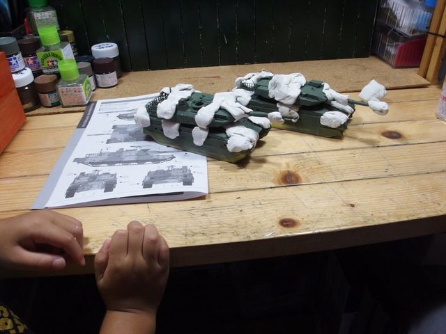 設定がを見ながら練り消しをつけていきます、坊主の来襲を受け流しながらの迷彩塗装前工程です。