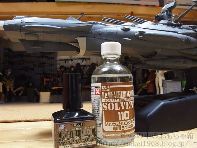 今回はMrウェザリングマスターの黒を薄めて使います。