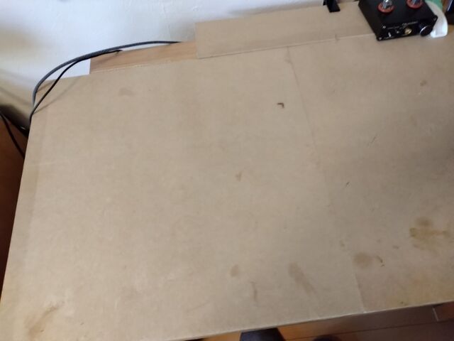 プラモ作成などするので汚さないように、天板の上にMDFの板を敷いていますが、